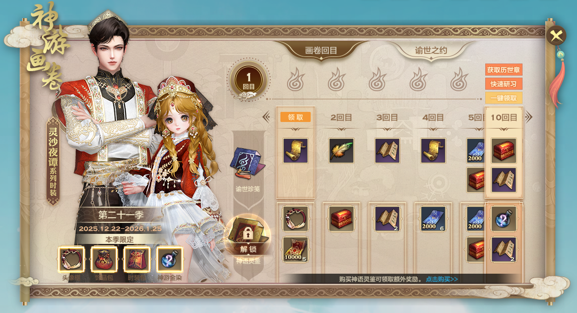 · 第二十一季神游画卷将于12月22日0点至1月25日23点59分期间开启,画卷内含大量传承秘宝,各位谕霸需完成特定的谕世之约任务来获取历世章奖励,每获得5枚历世章,即可完成1回目的研习,并获得对应的传承秘宝奖励。
